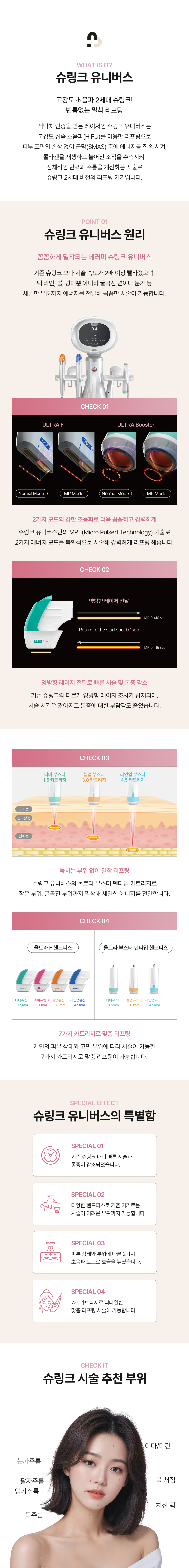 핸드피스 또한 울트라 부스터 핸드피스 즉, 원형의 펜 모양을 하고 있는 핸드피스가 추가되어 기존 슈링크 건타입 핸드피스로 시술하기 어려웠던 부위까지 세밀하고 꼼꼼한 리프팅 시술이 가능합니다.