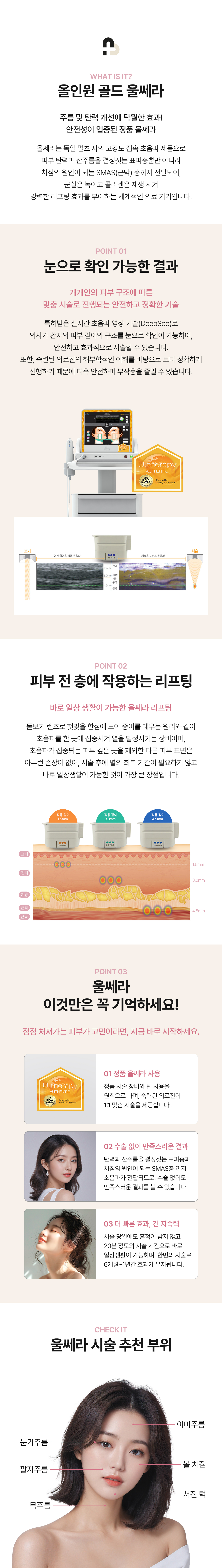 기본적으로 울쎄라 레이저는 늘어진 조직을 수축해 리프팅 효과를 볼 수 있으며 볼, 턱라인, 이중턱 처짐 개선 및 전체적인 탄력개선에 효과를 볼 수 있는 프리미엄 FDA 리프팅 장비입니다.